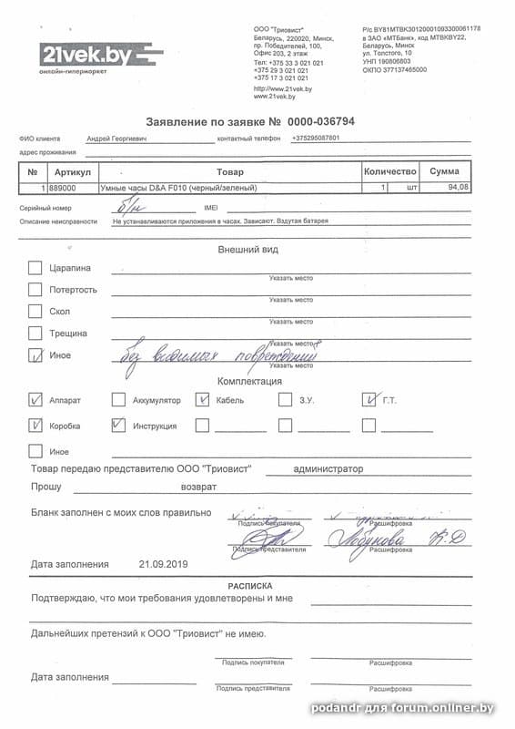 Добрый день! Подскажите, пожалуйста, 21.09.2019 покупал в 21 веке умные часы. забирал сам на Тростенецкой. При получении внешних дефектов не обнаружил, но проверить работоспособность не смогли - часы были разряжены полностью. Дома при включении в зарядку вздулся аккумулятор в часах, и быстро разряжается. Так же часы не соединяются с телефоном . Приложения часы не видят. и заявленные приложения в часах твиттер и фейсбук не установлены, хотя иконки есть, а при попытке их установить часы просто зависают. В тот же день отвез часы назад в магазин, оформил акт возврата товара с требованием возврата денег. В акте приемщик указала что часы новые без видимых дефектов. Сказала в течение 14 дней будут проверять часы ( сложный электронный товар), типа существенные ли недостатки и не сам ли я их сломал. Вопрос: могу ли я реально требовать возврат денег за некачественний товар или продавец может отремонтировать часы и отказать в возврате товара.