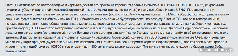 Спасибо, интересно было почитать. Дело не в том, что я ведусь на разводы консультанта. К этому я как раз был готов. Я уже не стал писать про такие пугалки, что у андроид тв через полгода забивается кэш и они жутко тормозят, ну и похожие заявления. Просто от покупки нового большого ТВ ожидаешь хоть немного радости, а не уйти обосранным из магазина. Остановился, в принципе, на модели TCL 65C89B (по вашему совету, из-за отсутсвия tcl 65c765 даже на озоне(). Осталось купить, но в добром месте ( и с рассрочкой).