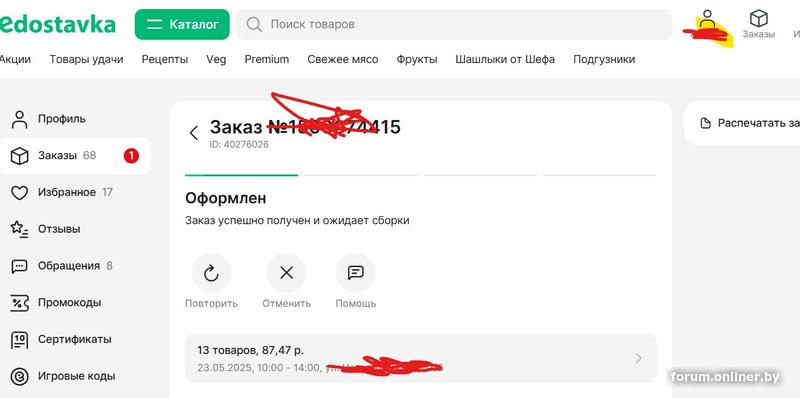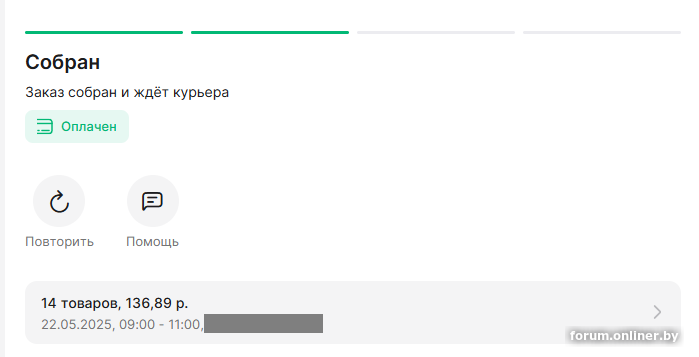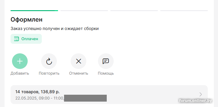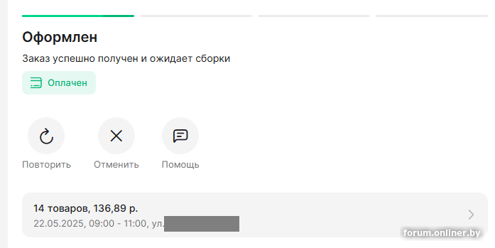 делал заказ, 18 мая ,видел, как появилась надпись, оплачен / собираем, пропала.