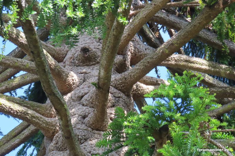 Ствол дерева, кора на котором может достигать толщины в 15 см. Листья на дереве остаются живыми на протяжении до 24 лет.