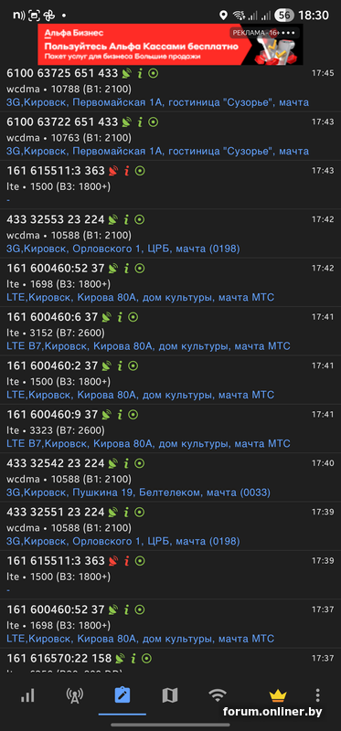 Первая строка - это LTE от beCloud'a (Band 20, 800МГц, EARFCN 6350), по первым двум цифрам eNodeB ID 602449 можно понять, что это Могилевская область, БС МТС, в случае МТСа (и life) номер БС совпадает с последующими четырьмя цифрами eNodeB ID, то есть LTE находится на БС МТС 2449, TAC 165, Sector ID 23, PCI 447.