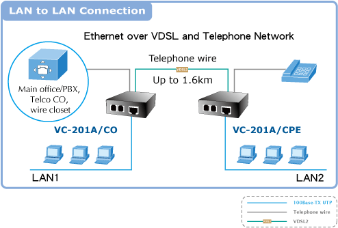 • VDSL: телефонная витая пара (AWG24 или лучше) до 1.6km