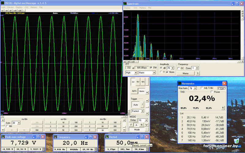 Ниже приведены скрины 20гц\4вт и 20кгц\1вт,а также меандр 1кгц...