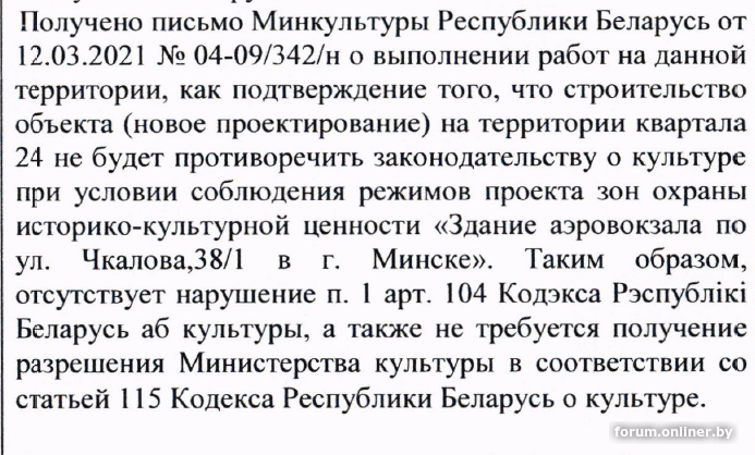 Согласно ст. 15 Конституции Республики Беларусь, государство ответственно за сохранение историко-культурного наследия. Согласно п. 1.1 арт. 103 «Кодэкса Рэспублікі Беларусь аб культуры» захаванне гiсторыка-культурных каштоўнасцей уключае ў сябе сiстэму арганiзацыйных, прававых, эканамiчных, матэрыяльна-тэхнiчных, навуковых, інфармацыйных i (або) iншых мер, накiраваных на недапушчэнне таксама навукова не абгрунтаванага пагаршэння ўмоў успрымання нерухомых матэрыяльных гiсторыка-культурных каштоўнасцей. Однако, наше государство вместо того, чтобы предпринять хоть какие-то меры для недопущения ухудшения условий восприятия здания аэровокзала, еще и называет пресечение злоупотребления пробелами и недостатками проекта зон охраны «ухудшением положения заказчика комплекса и условий его деятельности». Как это понимать?