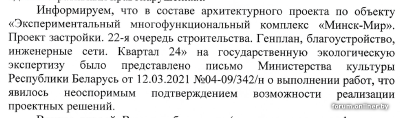 Но министерство культуры отказывается исполнять свою обязанность по устранению недостатков проекта зон охраны, чтобы вернуть ему потерянную функцию обеспечения сохранения историко-культурной ценности. Потому что, по его мнению, это повлияет на реализацию инвестиционного проекта «Экспериментальный многофункциональный комплекс «Минск-Мир»» и ухудшит положение заказчика комплекса и условия его деятельности. А значит, согласно п. 11 указа № 456, заказчик комплекса сможет полностью проигнорировать любой новый проект зон охраны и продолжить использовать недостатки старого проекта зон охраны 2008 года.