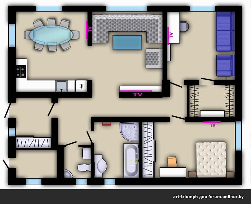 Расстановку мебели сделаю в ближайшее время., но дизайн проект не входит в рамки бесплатных консультаций на онлайнере.