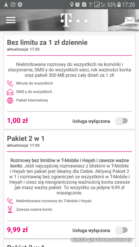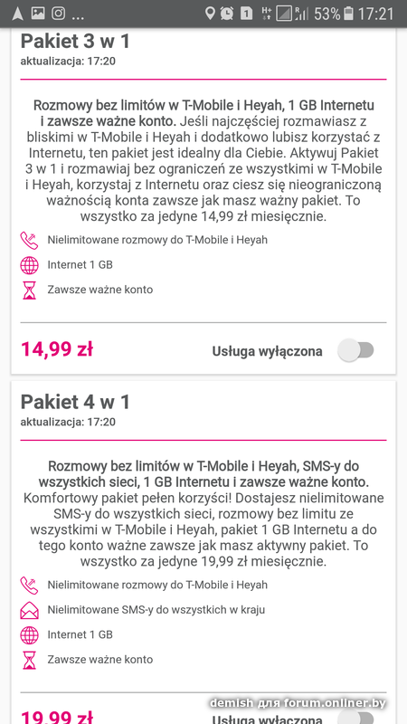 Надо учесть, что за один пакет больше 1,6 Гб (вне Польши) вы не получите. Причем при использовании (вне Польши) с Вас всё равно списывают деньги. И здесь тоже особенность: В ЕС раскусили приёмчики, что люди покупали самый дешёвый трафик в какой нибудь из стран, и потом пользовались в ущерб стане посещения. Теперь есть документ по которому различают добросовестных пользователей и недобросовестных. Добросовестные - те которые проводят в родной сети основное время. Недобросовестные - которые покупают пакеты для роуминга. Т.Е. мы с вами. (я не про всех, кто пользуется в Польше - добросовестные.) Так с недобросовестных по факту потом плата берётся больше. Это к сведению.