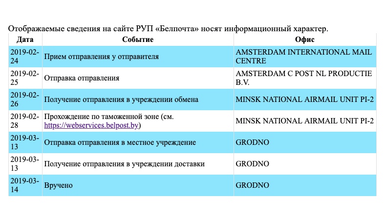 Статус «Получение отправления в учреждении обмена» - эта запись означает, что почтовое отправление поступило на территорию Республики Беларусь в учреждение международного почтового обмена Минск.