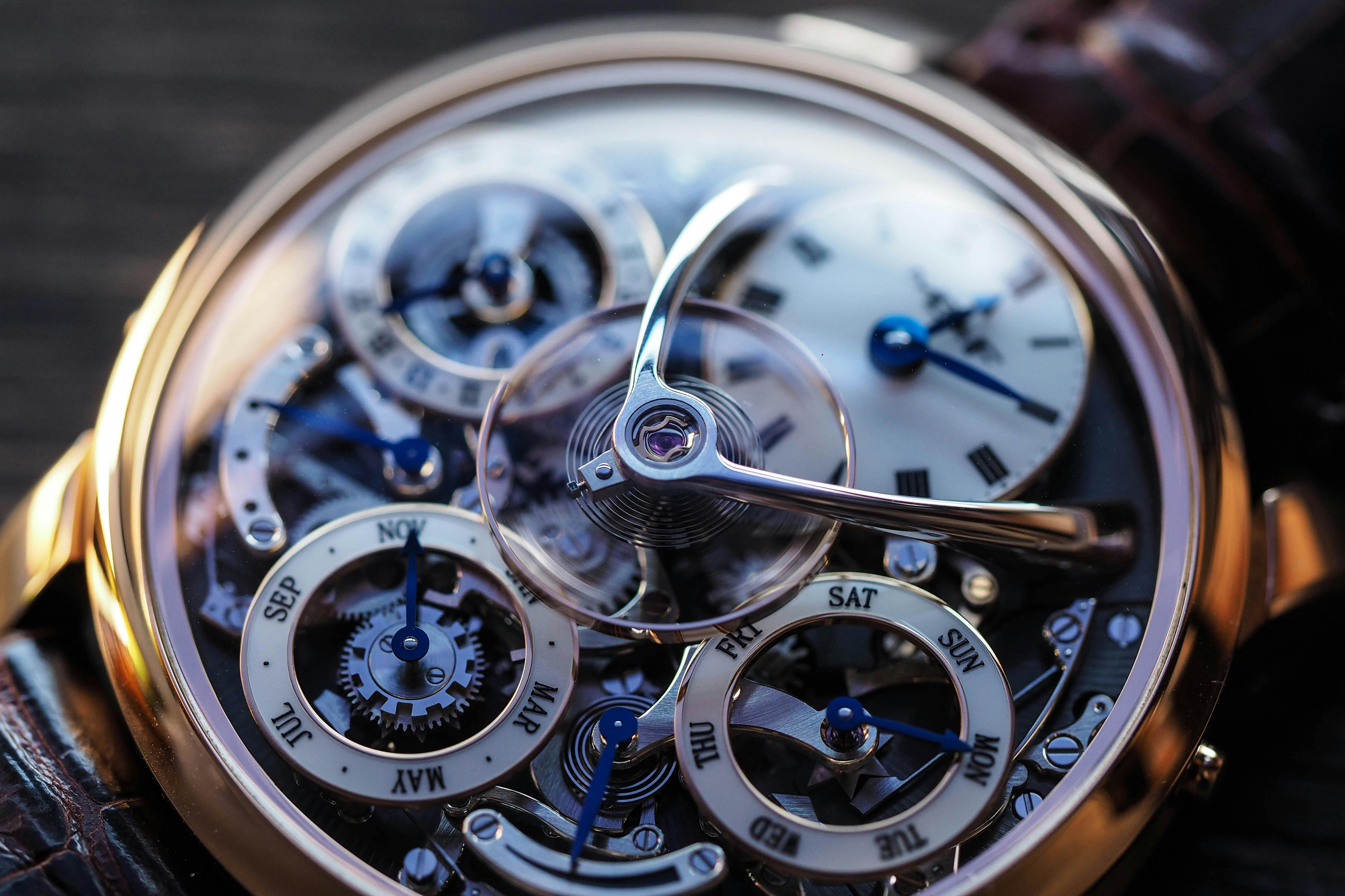 Arnold & Son claims to have extremely precise moon phases, with only one day’s deviation every 122 years (that will be corrected by a single push on the corrector placed on the caseband). That’s great. But what if you can’t really adjust this indicator properly? The thing is that the moon on the dial has no track, no point of reference to make a precise adjustment. The solution is actually located on the movement side, where a second moon phases indicator is located, this time with a precise scale and representations of the cycle of the moon. The rest of the movement isn’t forgettable either, as the Calibre A&S1512 of the Arnold and Son HM Perpetual Moon features a double barrel for 90 hours of power reserve. As usual with this manufacture, finishing is very pleasant: manually chamfered bridges with polished edges, fine circular graining and Côtes de Genève rayonnantes, blued screws with polished and chamfered edges.