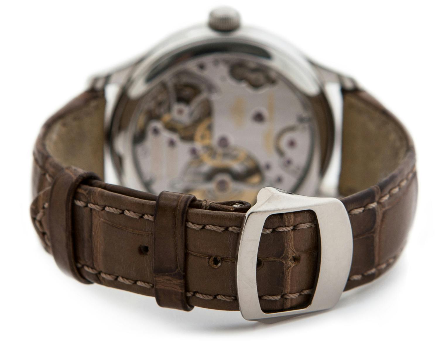The specificity of this edition of the Parmigiani Fleurier Tonda 1950 Tourbillon is to feature a textured dial. At first, you’ll only notice a plain white disc. However, the dial is made of polished white jade that reveals some nice inclusions in certain angles. Then again, this is understated luxury. The hands and the indexes are made with great care and perfectly polished (using the same design as the classical Tonda 1950).