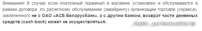Еще не забывайте, что если терминал эквайрится не в бабушкином банке, то ББ может не начислять кешбек. Для этого Вам придется спрашивать у кассира того же евроопта с каким банком-эквайером терминального оборудования у них заключен договор. В противном случае никаких кешбеков. :trollface: