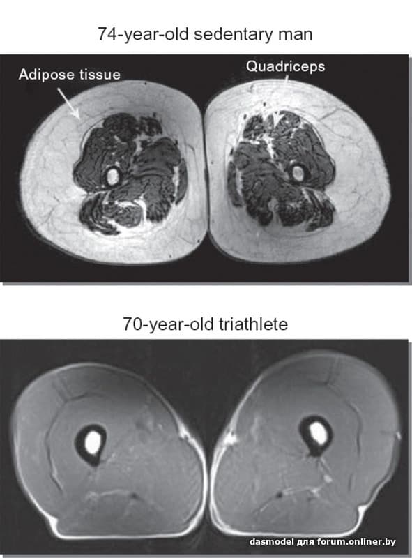 Бедро 74-летнего мужчины с сидячим образом жизни и 70-летнего триатлета.