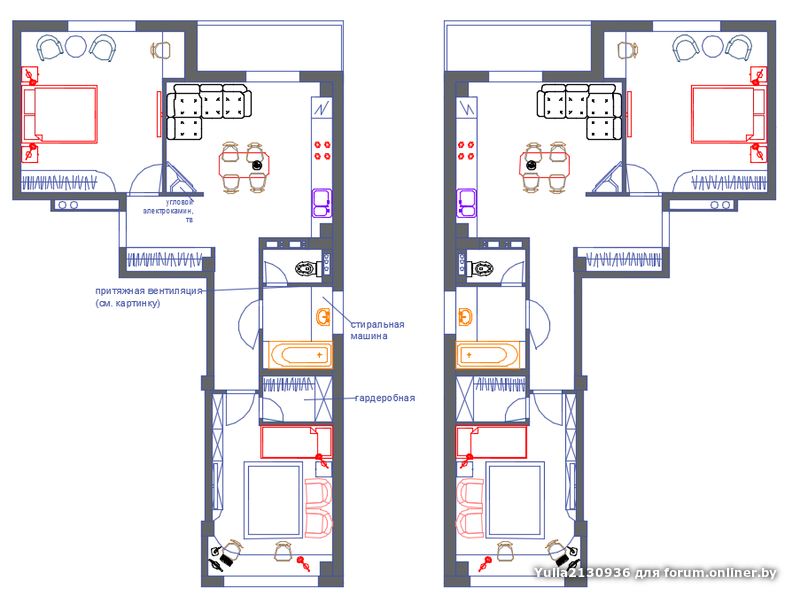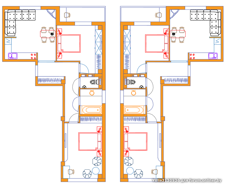 Yulia2130936:Варианты расстановки стен и мебели в двушках домов-прямоугольников бульвара.