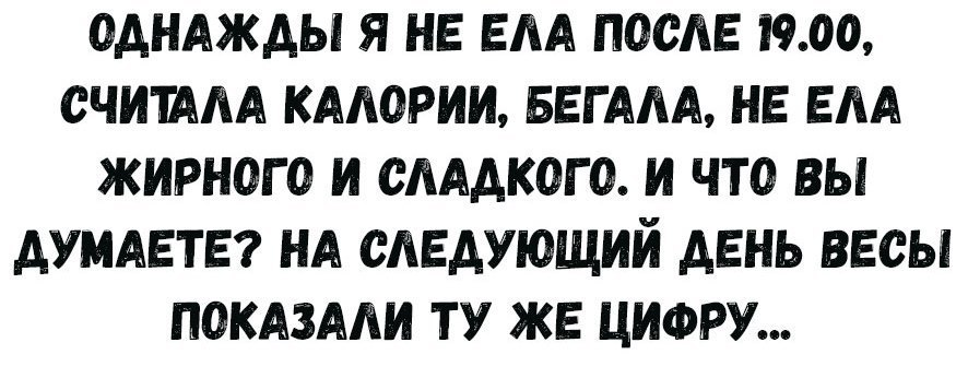 Проблема в том, что многие полные люди, ожидают чуда в сбросе веса в очень короткие сроки. Это чудо действительно может произойти с человеком с очень большим избытком веса, если он "сядет" на разумное питание и добавит хорошую физическую нагрузку. Но эффект этот будет временный. Плюс в интернете люди начитаются всяких бредовых советов о том, как можно сбросить вес нихера не делая. Естественно, что если нихера не делая можно сбросить вес, то что тогда должно произойти, если я выбегу на стадион и пробегу 250 метров?! Я же должен таять на глазах! И люди эти после такого бега бегут домой, хватают сантиметр, весы и к зеркалу..... И потом начинается: бегал, но похудеть не смог и т.д...