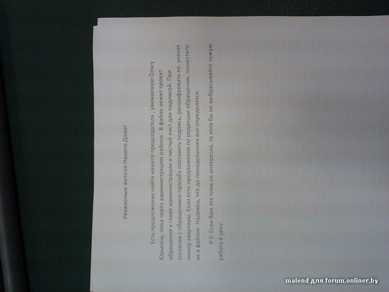 Только сейчас увидела файлик с обращением, ручки с собой не было, сегодня буду проходить и оставлю подпись. Пока там пустой лист бумаги. Сомневаюсь, что, во-первых, все смотрят на доску объявлений, а, во-вторых, подпишутся под таким обращением.