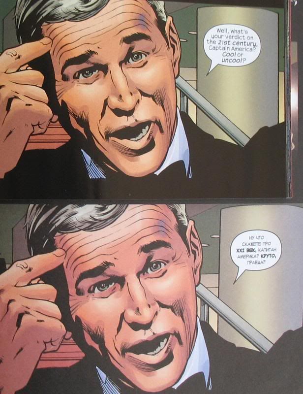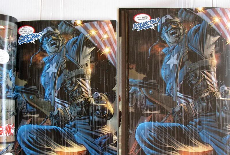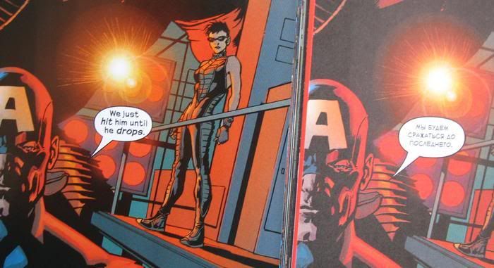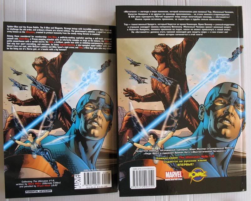 Сравнение оригинального трейда Ultimates с российским изданием. Российский вариант получился в три раза толще (из-за дешевой бумаги) с хромающей цветопередачей, но зато обложка твердая.