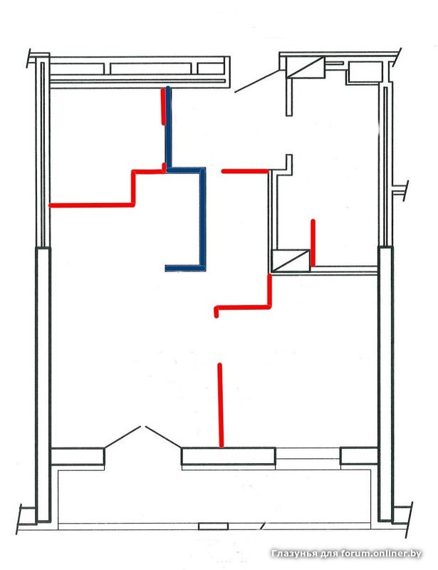 Добрый день. Подскажите, могут ли быть проблемы с согласованием такой перепланировки (красные линии - новые перегородки, синие - снести). Есть ли подводные камни с доп.перегородкой в санузле? Квартира однокомнатная с кухонным оборудованием. Хочу выделить доп. комнату(кабинет?) и гардеробную, кухонную зону перенести в центр(бывший коридор). Этаж 1 жилой (внизу еще административные этажи), дом монолит, электроплиты, Советский район