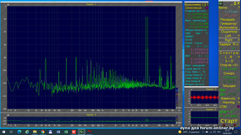 .Софтовый ген (можно поставить опционально,не обязательно встр.в анализатор) выдаст сигнал на выходе звуковой в соотв. с её х-ми и это как правило не меньше 1 вольта, а у большинства совр. выше.Дальше в соотв.с Ку испытуемого усила,но 1 вольта должно хватать практически любому для достижения Рном,регулятором уровня (РГ) на входе ослабляем сигнал до значений мощности,на которых хотим измерять.С его выхода через делитель на вход ЗК.Всё.