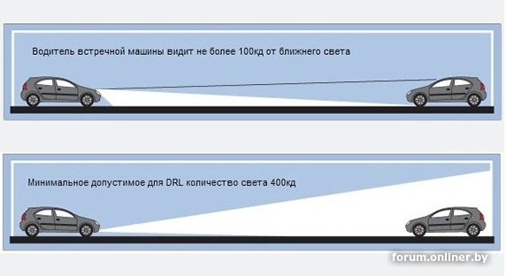 Плюс задача ближнего света освещать дорогу, т.е. там фары направлены и направлены чуть вниз. А диоды ДХО ненаправлены, иногда в качество ДХО используется дальний с уменьшенной яркостью, и световой поток от ДХО идёт выше, чем ближний.
