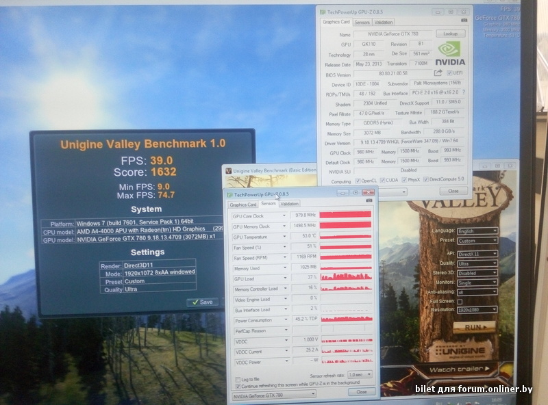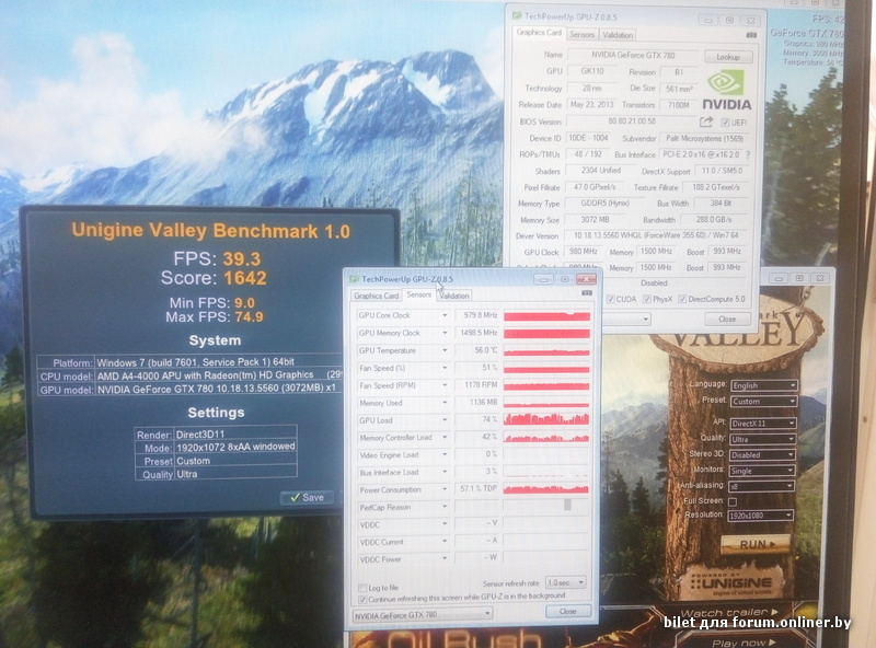 К сожалению свободен оказался только стендик на A4-4000, поэтому прогнал только Valley, который от проца никак не зависит. Настройки одинаковые, сначала ставился начисто 347.09, прогонялся бенчмарк, драйвер выпиливался DDU, ставился 355.60 и прогон на тех же настройках. К сожалению на бОльшее кака бычна нет времени в обозримой перспективе, но мне идея "гасить дровами" и так кажется абсурдной. Забивание на старые карты в новых проектах с соответствующей плашкой - да, охотно верю. Но не снижение производительности старых карт.
