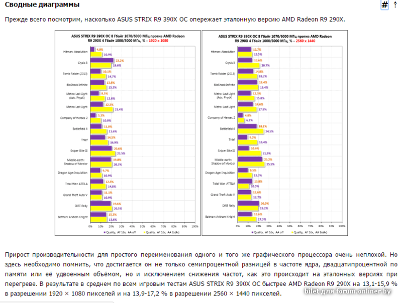 К тому же есть важный нюанс - во многих таких тестах берут референсные 290/290Х, которые просто небо и земля по сравнению с хорошими версиями типа Tri-X. Референсы жэстачайшэ троттлят по температуре, никогда не работая на заявленной частоте и заметно теряя от этого в производительности.