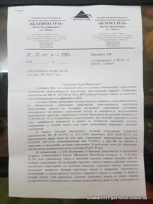 Всем доброго времени суток! В ноябре месяце оплачивал страховку на свой личный автомобиль на почте, оператор спросила у меня - "У ВАС ДТП БЫЛО", я с твердой уверенностью ответил нет, а так и есть на самом деле, через неделю звонок из белгосстраха, что мне нужно оплатить недоплату за страховку в размере 69,69р(т.к. установлен повышающий каэфициент) и ШТРАФ В ДВОЙНОМ РАЗМЕРЕ СУММЫ ПОВЫШЕННОГО КОЭФФИЦИЕНТА в сумме это 139,38р. Оказывается что вопрос работника почты был неправильно поставлен и нужно было спрашивать - ДТП С УЧАСТИЕМ ВАШЕГО АВТОМОБИЛЯ БЫЛО? А на самом деле был период времени в котором на машине ездил мой друг и он попал в мелкое дтп с оформлением евро протокола. Т.е. я из-за некорректного поставленного вопроса сейчас я должен оплатить в общем немалую сумму 209,07 р.