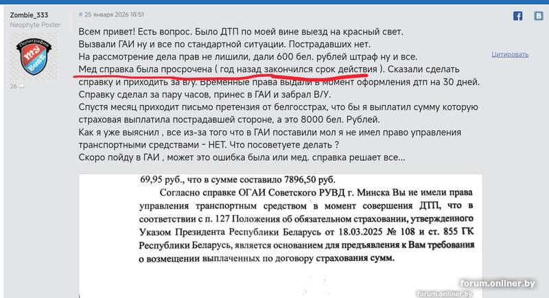 "Мне не объяснили год назад в 24 поликлинике то что нужно с мед справкой обратиться в ГАИ для снятия с базы, итог 200 руб подарил государству в виде штрафа и + штрафстоянка в аэропорту Минск2,по прилету не встретил семью, пришлось добираться на автобусе, проблем кучу заработал."(с)