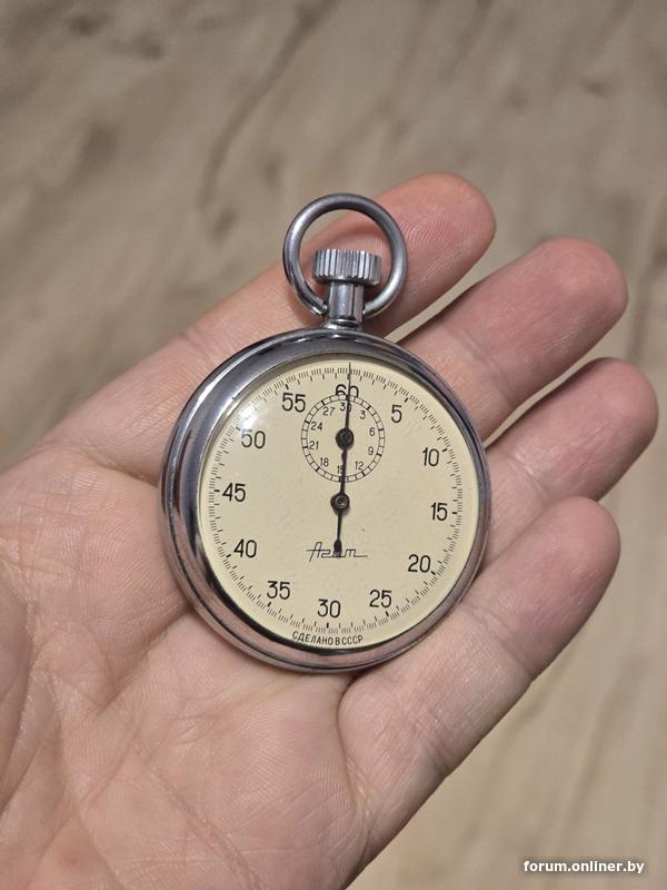 Футляр сохранился, пружина заведена до максимума, но не тикают, требуют ремонта. Есть такой же секундомер, только немного больше по диаметру, в рабочем состоянии.