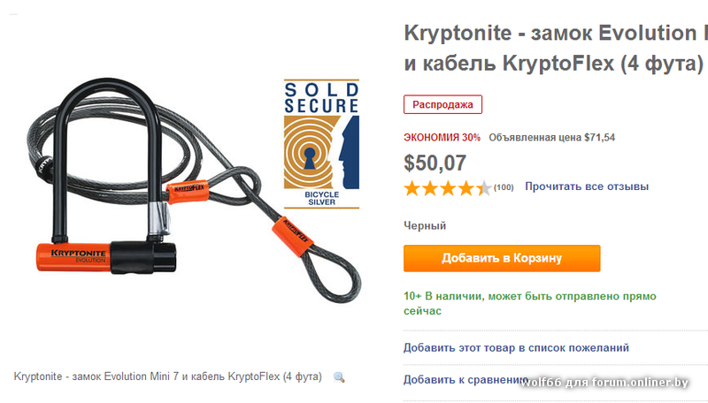 anthropocide:Приобрел себе Kryptonite Evolution Mini-7 with 4' Flex. Покупал здесь: http://baraholka.onliner.by/viewtopic.php?t=8921615 Очень хороший продавец и цены, утром позвонил, вечером заехал и замок уже был у меня) Поэтому рекомендую, за рекламу мне ничего не доплачивают.