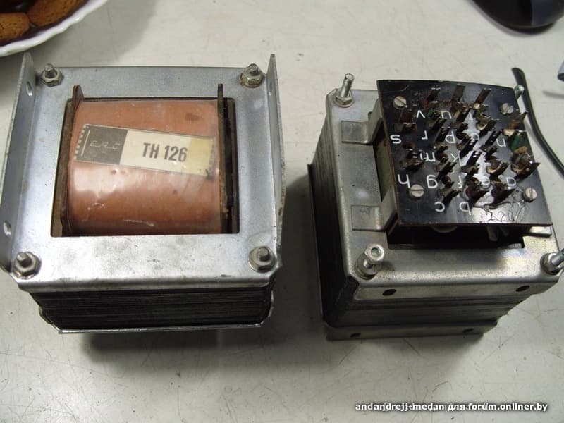 Силовой трансформатор от усилителя БЕАГ. 2 штуки. Анодное 250 вольт две накальные обмотки по 6.3 вольта. Между первички и вторичек есть экранная обмотка. Сечение керна 30Х55.
