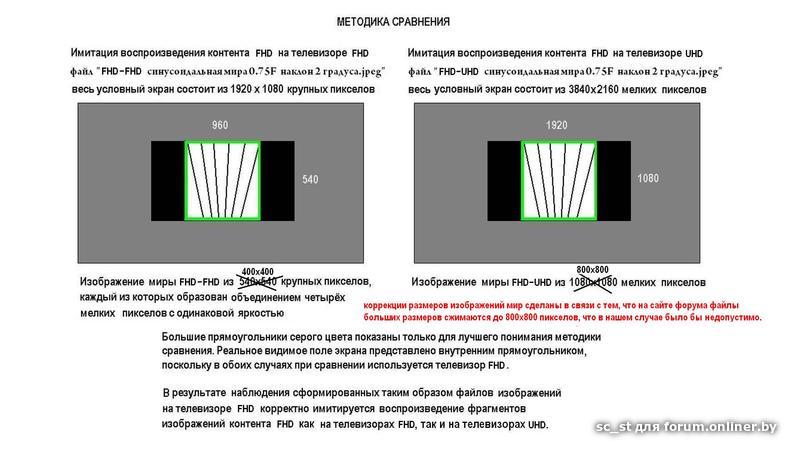 Используя принцип подобия, на экране телевизора FHD можно корректно воспроизвести и сравнить оба случая воспроизведения, а именно “пиксел в пиксел” без интерполяции (т.е. воспроизведение FHD изображений на FHD телевизоре), и имитацию корректной интерполяции FHD в UHD. Методика (принцип) такого сравнения проиллюстрирована на рисунке в файле “методика сравнения.jpeg”. Разумеется, преимущества, о которых говорится, будут проявляться в разной степени на разных элементах изображения.