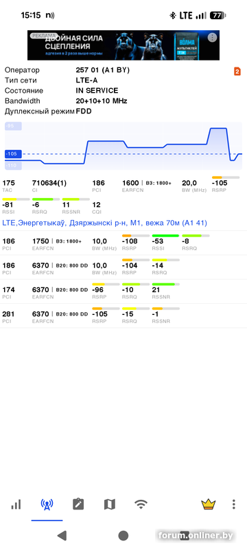 Подскажите пожалуйста, как понять что довесили в3 1800 на вышку в деревне? И второй вопрос почему с другой вышки такая низкая скорость upload 3.5мб если на загрузку 100 мб в среднем отдает через антену и правильный модем, который dw.. хотя с телефона отдает 30мб. Вышка Энергетыкаў 800 175 710634 :21:22:23 Дзяржынскі р-н М1, вежа 70м (А1 41)