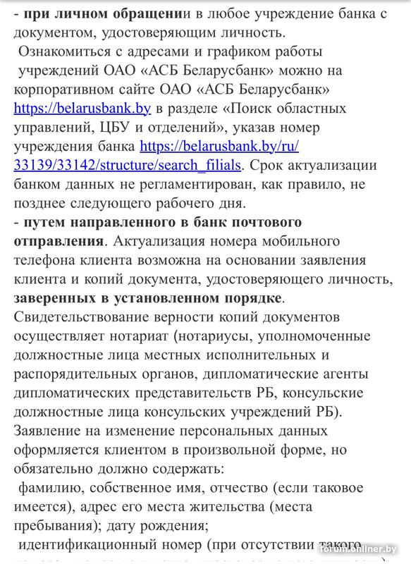 В Интернет-банкинге при этом также производится автоматическая актуализация данных клиента, кроме номера мобильного телефона. Работники банка изменяют номер мобильного телефона клиента в Интернет-банкинге в отдельном ПО. Для обновления информации о номере мобильного телефона в системе "Интернет-банкинг" клиенту необходимо обратиться в отделение банка с документом, удостоверяющим личность (внесение изменений путем направления в банк почтового отправления с подтверждающими документами не предусмотрено).