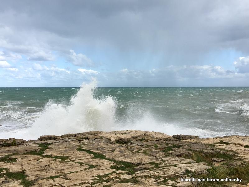 Волны были громадные,море бушевало будь здоров.В воздухе взвесь из дождя и соленых брызг.Молодожены,которых фотографы выставляли как можно ближе к краю утеса промокли и просолились.Но фото вероятно получились офигенные.Машина стояла метров за двести,брызги долетали до нее.Когда высохла,стала белой))))Прекрасная стихия.