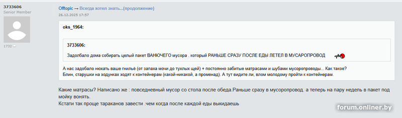 Скарбранд:3733606:Скарбранд:Еще раз ,все кого ,слышал ,за мусоропровод только пожилые которые ходить не могут,ходячие спокойно выкидывают в контейнер,ну и сливающие супы и кидающие строймусор.Как то был в доме в 9 этажном пару лет назад ,народ только заселился,самое первое ,что озвучили ,убрать мусоропровод в доме.А так вынес в контейнер и все,а тут открой мусоропровод ,заталкай мусор ,закрой,руки 10 минут отмывать от заразы,ведь никто сантитарную обработку не проводит внутри и крышек.