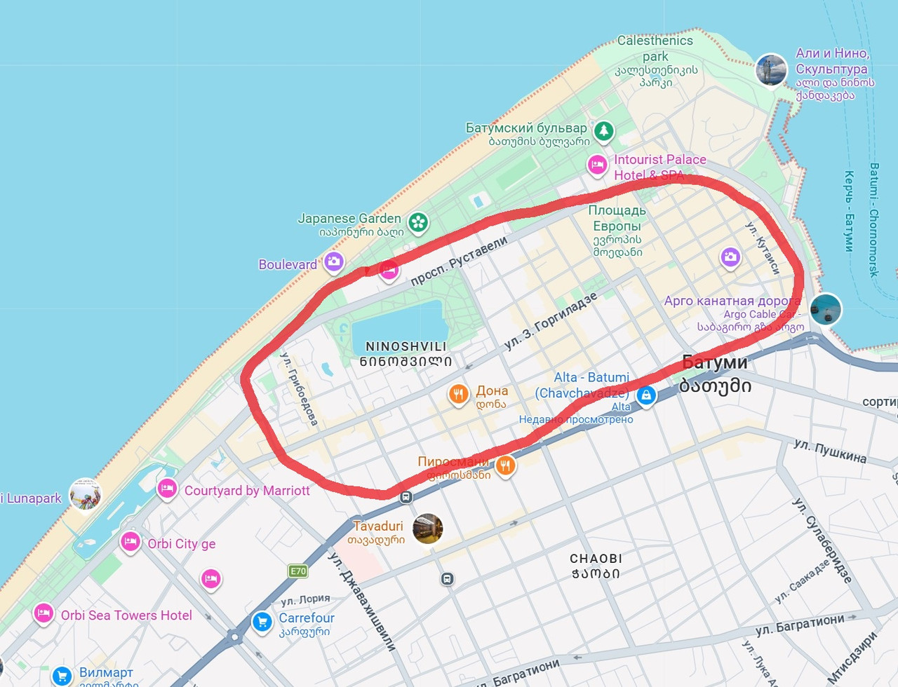 в Батуми также, выбрать отель, желательно отель - не апартаменты, в районе старого города, в этом радиусе, поближе к морю