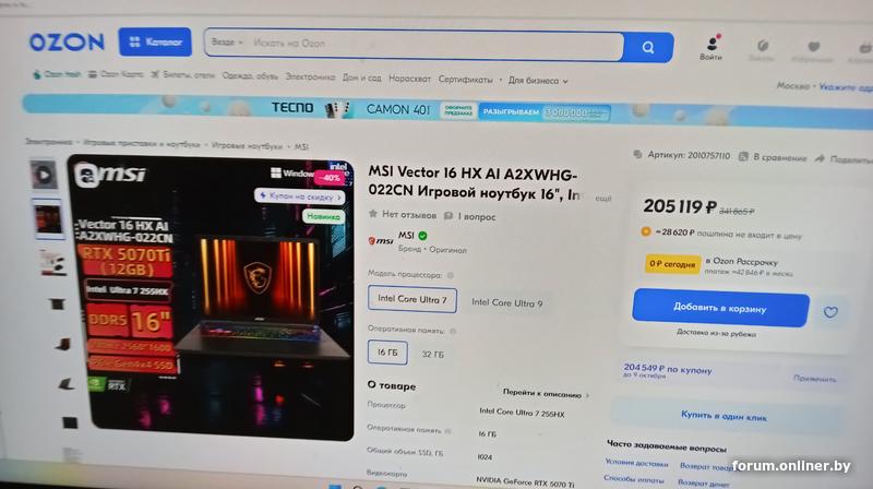 на озон ру есть эта модель MSI Vector 16 HX AI A2XWHG 022CN за 205к RUR без пошлины+ пошлина 28,6к =233,6к RUR