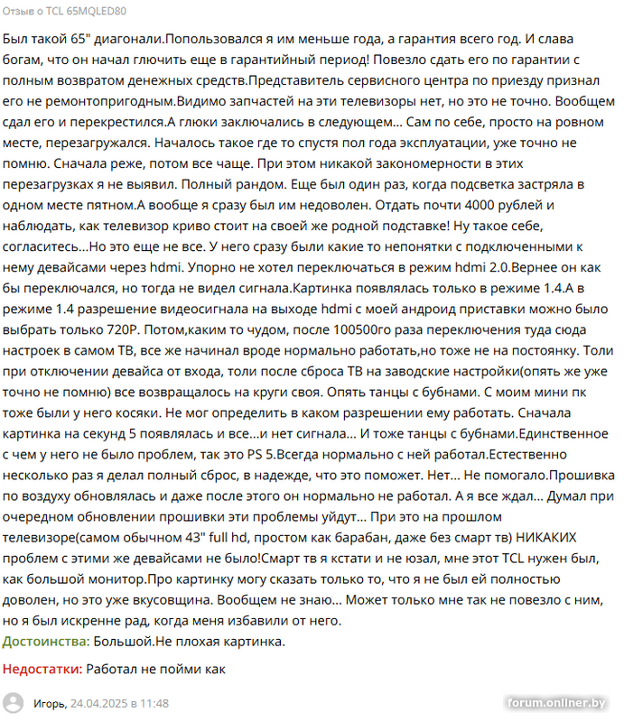 LG, который смарт отлично проигрывал с флэшки, но невозможно было смотреть что-то по миракаст(или как он там у них?) - картинка дёргалась. Да и в общем WebOS для эфира шустрый, а всё, что касается раздела "смарт" - дубовый и тормознутый.