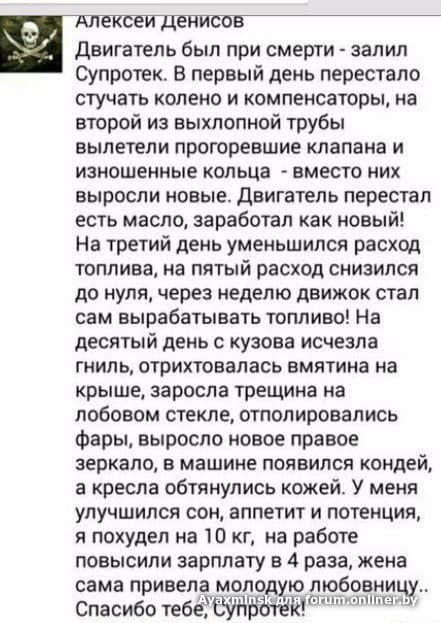 То, о чем я "млеею" даст нормальный эффект и по динамике и по расходу. То, что впариваете вы тут (в данном случае "впарить" - продать то, что совершенно не нужно) кроме эффекта "плацебо" в лучшем случае ничего не даст, в худшем может "убить" кат-коллектор. Надеюсь на понимание о ясности выражения.