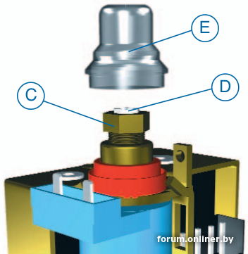Для уменьшения максимального выходного давления откручивать влево гайку C, придерживая винт D.
