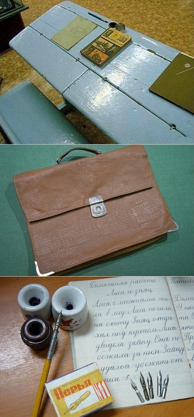 три года за такой просидел. И чернильницы и ручки такие были. Вот портфеля такого не носил, ранец был у меня. И помнится эти парты