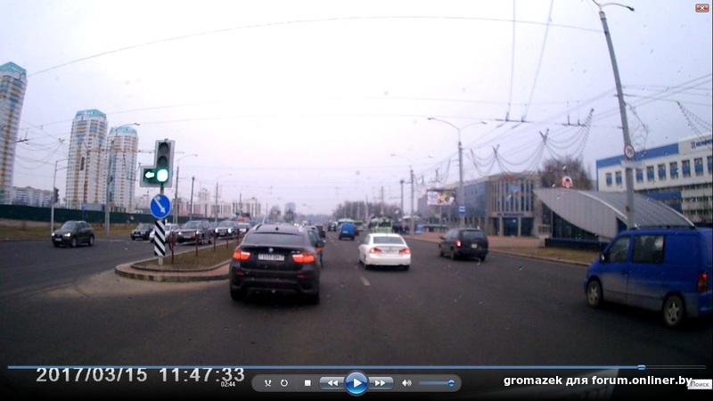 На видео видно как пешеходы переходят дорогу в тот момент, когда им горит красный сигнал светофора. Автомобиль с видеорегистратором поворачивал с бульвара Космонавтов на проспект Машерова в сторону Кобринского моста. Во время поворота водителю горел зеленый сигнал светофора.