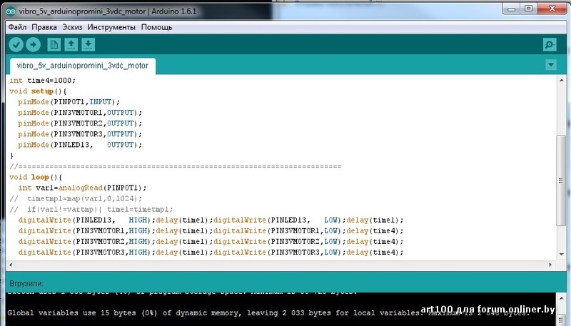 Протестиовано на виндовс 7 и ардуино самый... только что.. вот.. вот... сию секунду.... скачанный некая цифра 1.6.1 на фото же видно. И код сходу написан. Думал потенциометром ШИМ-ами задушить ардинку, да вот влом мне было под столом лазить потенциометр в куче ногой выколупывать. Так и остался код закоментированным.