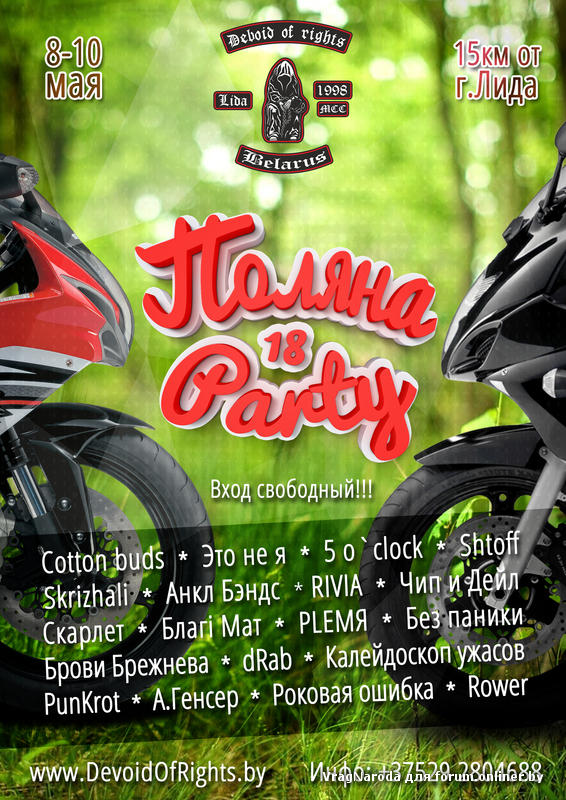 Друзья в этом году свое совершинолетие отметит наш мотоклуб Devoid of Rights MCC и традиционно мы устраиваем Поляна - Party, которая пройдет 8-10 мая, в 18ый раз на берегу реки Неман, будет куча драйва, rock n rolla и мотоциклов. Как всегда вход и въезд бесплатно )))